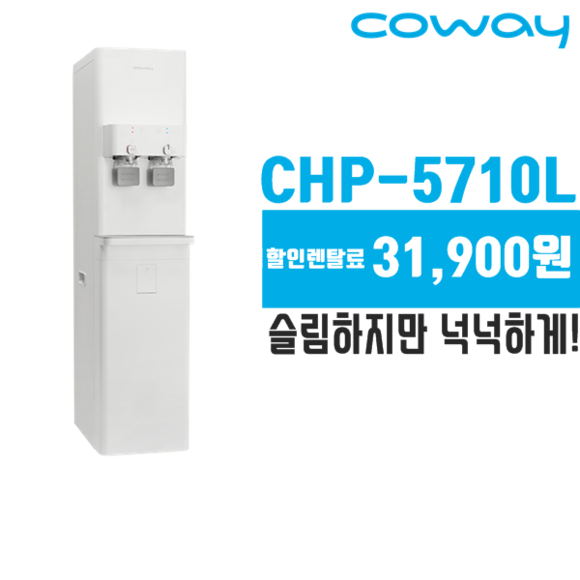 이번 제품은 CHP-5710L 입니다. 이 제품은 넉넉한 용량을 가지고 있으면서 공간을 많이 차지 하지 않는 깔끔한 디자인의 정수기 입니다.