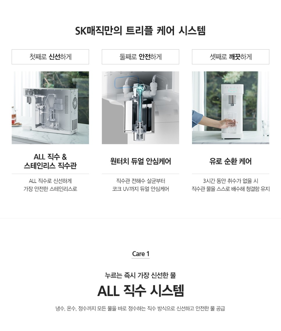 직수관 전해수 안심케어와 코크 UV 안심케어로 안심하고 물을 섭취할수있도록 합니다!