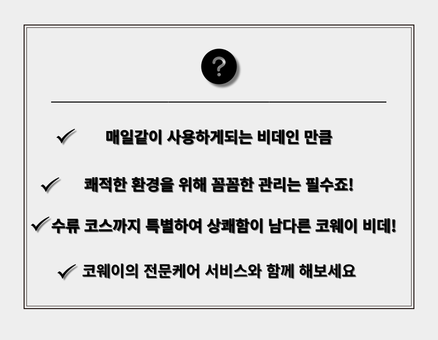 안녕하세요! 미아동코웨이비데렌탈을 알아보고 계신다면 비데는 역시 코웨이가 아닐까하는데요! 오랜 기간 비데로 많은 사랑을 받아온 코웨이에서 더 완벽해진 비데를 출시하였는데요! 오늘 준비한 코웨이 룰루 더블케어비데 입니다!^^ 완벽한 위생 비데로 새롭게 탄생했다고 하는데요! 어떤 기능들로 더 완벽해졌는데 코웨이라고 하니까 더 기대하게되네요! 미아동코웨이비데렌탈 포스팅으로 저와 함께 하나하나 살펴볼까요? 오늘 포스팅할 제품은 코웨이 룰루 더블케어 비데입니다! 룰루라는 이름이 익숙한분들이 많으실텐데요! 그만큼 비데 품질에 있어서는 코웨이라고 생각해요! 더블케어 비데의 장점을 총 5가지로 나누어서 알아볼건데요! 첫번째로는 유로,노즐,도기까지 전해수와 버블로 완벽하게 더블케어해준다는 점이에요! 비데의 모든곳을 강력하게 케어해주기 때문에 찝찝함은 덜어주고 상쾌함을 높여줄 수 있어요! 더블케어 비데의 특별한 점은 다지인에도 있는데요! 더 컴팩트한 디자인을 위해서 조작부는 리모컨 타입으로 벽에 붙여서 사용하기 때문에 공간 활용도가 높아졌으며 비데를 설치하지 않은것과 같은 사이즈로 좁은 공간에도 설치할 수 있도록 되어있어요! 깨끗한 케어를 위해 준비된 버블 카트리지도 비데 본체 안으로 들어가 있어요! 빈틈없는 위생을 보여주고자 물을 직접적으로 분사해주는 노블은 풀 스테인리스로 설계하였는데요! 더블케어 비데는 노즐이 하나가 아닌 트윈 노즐로 되어있어서 일반 세정용과 여성 세정용 노즐을 따로 분리해서 사용하기 때문에 더 위생적이고 2가지 모두 오염 걱정없는 스테인리스 노즐로 케어를 해줍니다. 뿐만 아니라 노블과 건도 덕트를 오염으로부터 봉쇄해주는 커버들도 분리형으로 되어있어 쉽게 분리하여 교체할 수 있도록 설계되어있어요! 코웨이에서는 이제 비데까지도 스마트폰 앱을 통해 편리한 관리가 이루어지도록 더블케어비데에 IoCare App 기능을 준비해두었는데요! 앱을 통해서 비데 상태에 대해 쉽게 파악할 수 있기 때문에 매번 전문가가 방문하지 않아도 나의 비데 상태를 파악하여 문제 없이 사용할 수 있어요! 또한 제품이 이상하다고 느껴질때에는 스마트 고장 진단으로 이상 부위를 파악하여 쉽고 빠른 A/S 처리가 가능합니다! 편리한 비데 사용이 될 수 있도록 준비되어있는데요! 내가 원할때 비데 구석구석 세척할 수 있도록 원터치로 비데를 도기에서 분리할 수 있습니다! 비데 본체는 IPX6 등급, 리모컨은 IPX7 등급의 방수 등급이기 때문에 안전하게 물청소를 할 수 있으며 피부와 직접적으로 가장 많이 맞닿는 변좌에도 99% 항균 인증 변좌를 적용하여 위생성을 높여주었어요! 미 사용시에는 절전모드로 변좌와 온수 온도를 낮게 설정하여 전기사용량까지 줄여줍니다! 깨끗함으로 쾌적한 세정이 될 수 있도록 아이웨이프 시스템의 4단계 수로 코스로 마지막 까지 섬세하며 세정 시간부터 범위,수압까지 나의 컨디션에 맞춰 수류 코스를 제공합니다. 마지막으로 코웨이 비데 중 유일하게 전문가 관리 / 자가관리 선택이 가능하니 관리 방법에 대해서 알아보도록 하겠습니다! 코웨이 비데가 오랫동안 사랑받아온 이유는 차별화된 전문적인 관리 서비스가 있기 때문인데요! 주요 부품 교체는 물론이고 분당 3,600번 진동하는 파워클린 브러시로 구석구석 비데 세척까지 이루어지는데요! 도기세정제를 투입하여 비데 뿐만 아니라 도기도 케어해주어요! 방문 전 서비스 사전 알림을 톡으로 보내드리고 서비스 완료 후 다음방문 예약일시까지 안내해줍니다. 정기적& 전문적으로 더 꼼꼼한 관리를 원한다면 방문관리 약정으로 진행해서 사용해보세요! 방문관리 약정보다 더 저렴한 렌탈료로 스스로 관리하며 사용할 수 있는 셀프관리 약정도 준비되어있는데요! 내가 원하는 시간에 손쉽게 자가관리할 수 있습니다. 1년마다 주요 부품을 담은 서비스 키트를 배송해주는데요! 2개월마다 버블 카트리지를 교체해주고, 4개월마다 프리 마이크로 필터, 건조커버, 노즐 커버를 교체해주면되요! 누구나 손쉽게 교체할 수 있도록 설계되어있으니 셀프관리도 걱정없이 사용할 수 있어요! 더블케어 비데는 코웨이의 신제품인 만큼 더 완벽하게 출시되었는데요! 여러분들이 비데를 더 저렴하게 사용할 수 있는 코웨이 제휴카드와 함께 더 현명한 소비의 미아동코웨이비데렌탈이 되어보시길 바랄게요! 우리의 뒤처리를 깨끗하게 케어해주는 비데인만큼 다양한 코웨이 비데를 슬기로운 렌탈생활을 통해서 쉽고 빠르게 만나보시길 바랄게요! 그럼 오늘 준비한 미아동코웨이비데렌탈은 여기서 마무리할게요! 감사합니다.