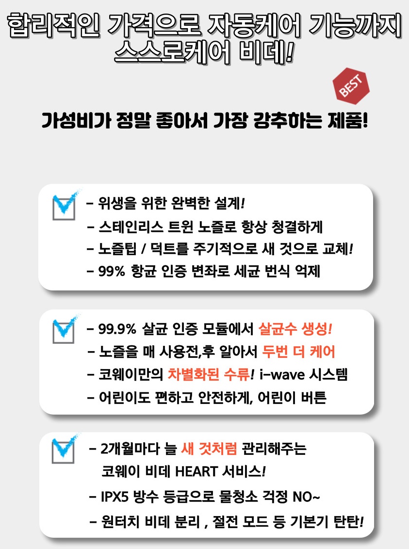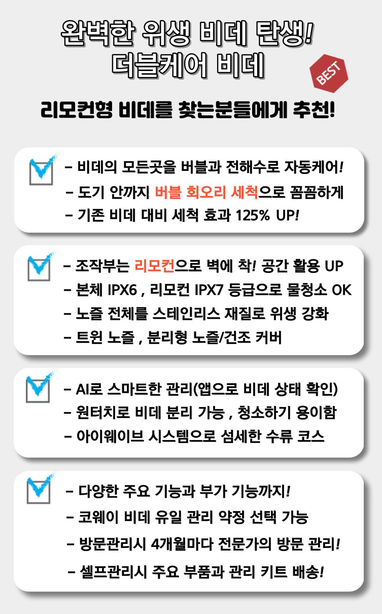 안녕하세요! 우이동코웨이비데렌탈을 알아보고 계신다면 비데는 역시 코웨이가 아닐까하는데요! 오랜 기간 비데로 많은 사랑을 받아온 코웨이에서 더 완벽해진 비데를 출시하였는데요! 오늘 준비한 코웨이 룰루 더블케어비데 입니다!^^ 완벽한 위생 비데로 새롭게 탄생했다고 하는데요! 어떤 기능들로 더 완벽해졌는데 코웨이라고 하니까 더 기대하게되네요! 우이동코웨이비데렌탈 포스팅으로 저와 함께 하나하나 살펴볼까요? 오늘 포스팅할 제품은 코웨이 룰루 더블케어 비데입니다! 룰루라는 이름이 익숙한분들이 많으실텐데요! 그만큼 비데 품질에 있어서는 코웨이라고 생각해요! 더블케어 비데의 장점을 총 5가지로 나누어서 알아볼건데요! 첫번째로는 유로,노즐,도기까지 전해수와 버블로 완벽하게 더블케어해준다는 점이에요! 비데의 모든곳을 강력하게 케어해주기 때문에 찝찝함은 덜어주고 상쾌함을 높여줄 수 있어요! 더블케어 비데의 특별한 점은 다지인에도 있는데요! 더 컴팩트한 디자인을 위해서 조작부는 리모컨 타입으로 벽에 붙여서 사용하기 때문에 공간 활용도가 높아졌으며 비데를 설치하지 않은것과 같은 사이즈로 좁은 공간에도 설치할 수 있도록 되어있어요! 깨끗한 케어를 위해 준비된 버블 카트리지도 비데 본체 안으로 들어가 있어요! 빈틈없는 위생을 보여주고자 물을 직접적으로 분사해주는 노블은 풀 스테인리스로 설계하였는데요! 더블케어 비데는 노즐이 하나가 아닌 트윈 노즐로 되어있어서 일반 세정용과 여성 세정용 노즐을 따로 분리해서 사용하기 때문에 더 위생적이고 2가지 모두 오염 걱정없는 스테인리스 노즐로 케어를 해줍니다. 뿐만 아니라 노블과 건도 덕트를 오염으로부터 봉쇄해주는 커버들도 분리형으로 되어있어 쉽게 분리하여 교체할 수 있도록 설계되어있어요! 코웨이에서는 이제 비데까지도 스마트폰 앱을 통해 편리한 관리가 이루어지도록 더블케어비데에 IoCare App 기능을 준비해두었는데요! 앱을 통해서 비데 상태에 대해 쉽게 파악할 수 있기 때문에 매번 전문가가 방문하지 않아도 나의 비데 상태를 파악하여 문제 없이 사용할 수 있어요! 또한 제품이 이상하다고 느껴질때에는 스마트 고장 진단으로 이상 부위를 파악하여 쉽고 빠른 A/S 처리가 가능합니다! 편리한 비데 사용이 될 수 있도록 준비되어있는데요! 내가 원할때 비데 구석구석 세척할 수 있도록 원터치로 비데를 도기에서 분리할 수 있습니다! 비데 본체는 IPX6 등급, 리모컨은 IPX7 등급의 방수 등급이기 때문에 안전하게 물청소를 할 수 있으며 피부와 직접적으로 가장 많이 맞닿는 변좌에도 99% 항균 인증 변좌를 적용하여 위생성을 높여주었어요! 미 사용시에는 절전모드로 변좌와 온수 온도를 낮게 설정하여 전기사용량까지 줄여줍니다! 깨끗함으로 쾌적한 세정이 될 수 있도록 아이웨이프 시스템의 4단계 수로 코스로 마지막 까지 섬세하며 세정 시간부터 범위,수압까지 나의 컨디션에 맞춰 수류 코스를 제공합니다. 마지막으로 코웨이 비데 중 유일하게 전문가 관리 / 자가관리 선택이 가능하니 관리 방법에 대해서 알아보도록 하겠습니다! 코웨이 비데가 오랫동안 사랑받아온 이유는 차별화된 전문적인 관리 서비스가 있기 때문인데요! 주요 부품 교체는 물론이고 분당 3,600번 진동하는 파워클린 브러시로 구석구석 비데 세척까지 이루어지는데요! 도기세정제를 투입하여 비데 뿐만 아니라 도기도 케어해주어요! 방문 전 서비스 사전 알림을 톡으로 보내드리고 서비스 완료 후 다음방문 예약일시까지 안내해줍니다. 정기적& 전문적으로 더 꼼꼼한 관리를 원한다면 방문관리 약정으로 진행해서 사용해보세요! 방문관리 약정보다 더 저렴한 렌탈료로 스스로 관리하며 사용할 수 있는 셀프관리 약정도 준비되어있는데요! 내가 원하는 시간에 손쉽게 자가관리할 수 있습니다. 1년마다 주요 부품을 담은 서비스 키트를 배송해주는데요! 2개월마다 버블 카트리지를 교체해주고, 4개월마다 프리 마이크로 필터, 건조커버, 노즐 커버를 교체해주면되요! 누구나 손쉽게 교체할 수 있도록 설계되어있으니 셀프관리도 걱정없이 사용할 수 있어요! 더블케어 비데는 코웨이의 신제품인 만큼 더 완벽하게 출시되었는데요! 여러분들이 비데를 더 저렴하게 사용할 수 있는 코웨이 제휴카드와 함께 더 현명한 소비의 우이동코웨이비데렌탈이 되어보시길 바랄게요! 우리의 뒤처리를 깨끗하게 케어해주는 비데인만큼 다양한 코웨이 비데를 슬기로운 렌탈생활을 통해서 쉽고 빠르게 만나보시길 바랄게요! 그럼 오늘 준비한 우이동코웨이비데렌탈은 여기서 마무리할게요! 감사합니다.