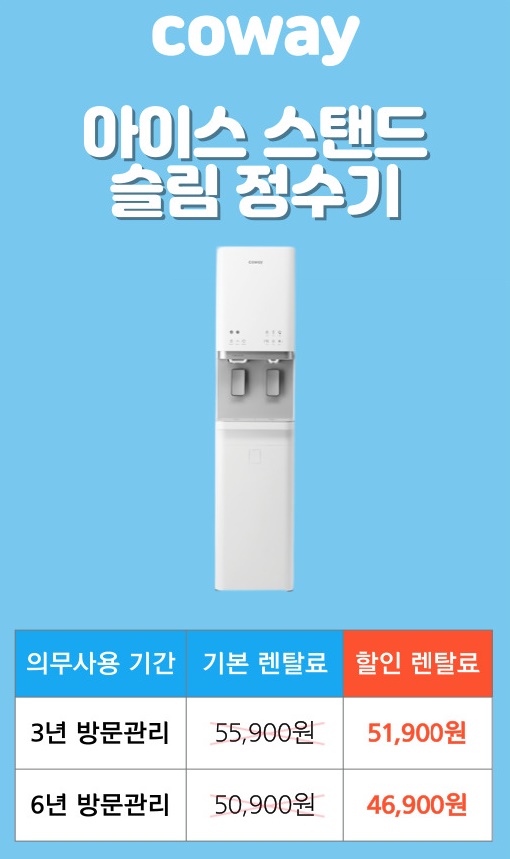 안녕하세요! 코웨이에서 아이콘 정수기가 최고의 인기를 누리고 있었는데요 이번에 더 새롭게 아이콘정수기2가 출시되었어요! 제가 포스팅을 하기 위해서 한번 살펴봤는데 진짜 기능 대박이고 어떻게 이렇게 더 완벽하게 출시될 수 있는지 역시 코웨이구나! 라고 생각이 들었는데요! 그래서 오늘 여러분들과 함께 아이콘정수기2의 새로워진 점들을 함께 알아보려고 합니다! 요즘 일상생활에 편리함을 주는 가전들이 많아지게 되면서 주방에 놓을 가전들도 다양해졌는데요. 그 중에서도 저는 정수기가 가장 중요하고, 또 가장 많이 찾는 주방 가전이라고 생각을해요! 그래서 코웨이에서는 필수적인 정수기를 설치하면서도 주방 공간이 더 여유로울 수 있도록 크기가 정~~말 작은 정수기인데요! 놀라지마세요! 정수기 깊이 사이즈가 25cm밖에 되지 않아요! 어떻게 이렇게 작게 만들었을지 대단하다고 느껴지네요. 정수기에서 가장 오염되기 쉬운 부분이라고한다면 공기나 먼지가 맞닿을 수 있는 파우셋인데요. 그래서 살균-세척-교체 3단계 완벽한 파우셋 위생관리가 이루어집니다. 사용자가 따로 신경을 쓰지 못하더라도 정수기가 알아서 살균을 해주는데요! 물을 추출 후 매번 살균을 해주고 취침시간이나 외출때에 정수기를 사용하지 않아도 6시간마다 알아서 UV 살균을 해줍니다. 이미지에 보이는것 처럼 파우셋을 정수기 윗면에서 위로 뽑아서 분리할 수 있어서 수시로 세척할 수 있어요 그리고 파우셋 전체는 안전한 트라이탄 소재로 되어있는데요! 이 소재의 장점은 환경 호름 걱정도 없어서 신생아에게도 안전한 친환경 소재이며, 강한 내열성과 내구성을 보여주어 오래도록 깨끗하게 사용할 수 있어요. 기능이 대박인게 원래는 정수기에서 보통 85℃ 정도되는 온수를 사용할 수 있었는데요. 이 때문에 정수기를 통해서 컵라면에 온수를 받을때에 다소 부족한 온도로 덜 익거나하여 제대로 이용하지 못했었는데 이제는 정수기에서 약 100℃의 초고온수도 빠르고 풍부하게 이용할 수 있어서 단점을 없애주었습니다! 초고온수 뿐만 아니라 4단계 맞춤 온수로 되어있으며 용량 맞춤 출수도 my용량이 추가되어 총 5단계 정량 출수가 가능합니다. 정수기 관리가 더욱 쉬워진 이유는 주요 부품은 원터치로 간단하게 교체할 수 있으면서 필터 교체 주기와 필터세척은 정수기가 알아서 다 해주기 때문인데요! 정수기에서 가장 중요한 필터 관리를 할때에 사용자가 따로 신경쓰지 않고 있어도 필터교체주기를 정수기가 파악하여 안내해줍니다! .주기적으로 필터를 교체해주면서 깨끗한 수질을 유지할 수 있으며 자가관리 후 폐필터도 알림톡으로 회수 신청을 하면 코웨이가 무상 방문 수거를 도와줍니다. 그리고 평상시에 제품에 이상이 있는지 없는지 수시로 확인할 수 있도록 준비되어있는데요! 만약에 자가관리를 하면서 제품의 이상이 발견되면 간단한 해결방법을 안내해주어 일일이 A/S를 신청할 필요가 없으며 해결되지 않는 고장일 경우에는 센서로 감지한 고장 부위를 고객센터에서 미리 알고있어 신속하고 정확한 A/S 접수가 이루어집니다. 냉수 추출 방식은 컴프레서를 없애고 전자 냉각 시스템으로 되어있어서 조용하게 냉각하여 출수되기 때문에 생활소음도 걱정없으며 온수도 순간 가열로 빠르게 가열하여 에너지도 절감해주고 4단계 온수 기능도 바로바로 이용해볼 수 있어요! 그리고 정수와 온수는 직수이면서 냉수는 저수조 방식이며 물이 닿는 부분이 안전한 소재이기 때문에 걱정없고 냉수를 더 빠르고 풍부하게 출수해주어 코웨이만의 시스템으로 되어있습니다. 군산코웨이정수기렌탈을 이용하면서 믿을 수 있는 품질은 물론 최고의 서비스와 함께 해볼 수 있는데요! 관리 방식도 고객의 사용 스타일에 따라 선택할 수 있어요. 문제없이 주기적인 방문관리를 받을 수 있다면 방문관리 약정을 선택하면 좋지만 요즘같이 바쁜 일상속에서 시간이나지 않아 제대로된 관리를 받지 못하는 분들이라면 주요 교체 소모품이나 자가관리키트를 택배로 배송받아서 내가 원하는 시간에 관리하는 셀프관리로 선택하여 늘 깨끗한 정수기로 사용하시면됩니다! 제가 오늘 군산코웨이정수기렌탈 추천을 해드렸는데요! 아이콘 정수기2를 보자마자 기존에도 좋았는데 더 좋아질 수가 있구나 ! 괜히 코웨이가 아니구나 라는 생각이들어서 군산코웨이정수기렌탈 추천을 꼭 해드리고 싶어서 이렇게 준비했어요! 완벽한 위생뿐만 아니라 디자인까지도 더 특별해진 코웨이 정수기를 제휴카드를 활용하면 최소 실적으로도 매달 13,000원을 할인받을 수 있으니 제휴카드도 꼼꼼하게 확인해보셨으면 좋겟습니다!
